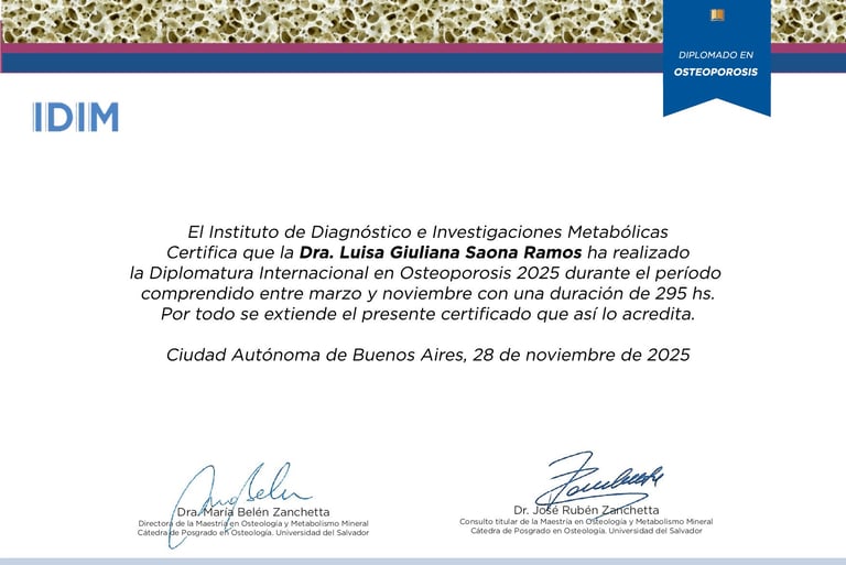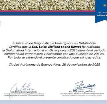 Aquí puedes ver mi diploma en Osteoporosis y mi diploma en Medicina Funcional, reflejo de mi compromiso con la salud integral.